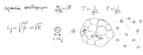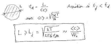 נבחן כעת את המצב ההפוך: ענן של מסות m, בגודל L, שמאופיין בתנועה תרמית. אנו מזניחים את הכוחות הכבידתיים. הענן יתפזר ברגע מציין שווה ל-L, מחולק בערך הממוצע של מהירות התנועה התרמית , שקשורה לטמפרטורה המוחלטת T (ראו תיקון קודם, על תורת הנייחות של גזים). נקרא לזמן זה זמן התפזרות td. בתוך כדור של גז שני התהליכים יתנגדו. אנו מגלים כי זמן התפזרות גדול מזמן המאפיין של התפוצצות או התרחבות, אם פשוט הממד של "הגרמייה" נוגעת במרחק מציין מסוים, אורך ג'ינס Lj