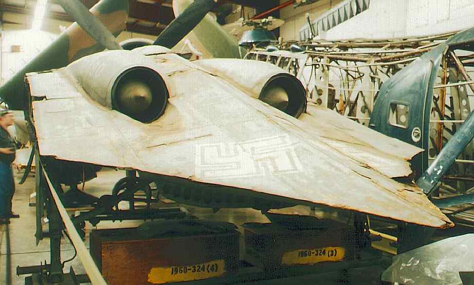 1944 के दिसंबर में, जर्मन अभी भी इन अद्वितीय यानों पर तेजी से काम कर रहे थे, उद्देश्य दो-इंजन लड़ाका-बमवर्षक विमानों के निर्माण में जुमो टर्बोरिएक्टर के साथ आगे बढ़ना था। इन यानों की रेखाओं की पतलापन नीचे दिखाई गई तस्वीर में हॉर्टेन IX V1 और उसके पायलट, हेंज स्केडहौर के साथ बहुत स्पष्ट दिखाई देता है।