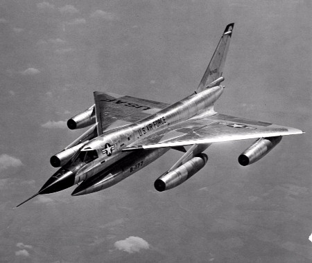 En règle générale le problème était d'accroître le rayon d'action des vecteurs, leur vitesse, leur altitude, leur invulnérabilité. L'accroissement de la vitesse passait obligatoirement par une entrée dans le monde du supersonique mais se posa alors immédiatement la question de la traînée d'onde, qui croît en gros comme le cube du nombre de Mach. Une tentative correspondit au Hustler bisonique. (Une jolie photo trouvée par J.P.Ballard qui montre bien ce quadri-réacteur portant sous son ventre son "mod" avec sa charge militaire, profilée pour pouvoir effectuer une pénétration en supersonique):