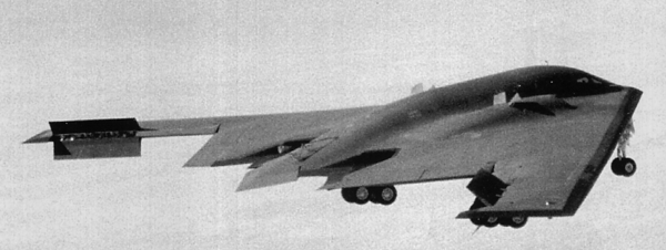 Sur cette photo lepremier prototype du B2, prise en 1989 à Edwards, qui possède encore ses bords d'attaque noirs. En ouvrant en grand les volets de bouts d'ailes on les transforme en aérofreins. On distingue la "queue de castor" en position "à piquer". Sur le dessus des capotages des moteurs des volets ouverts qui fournissent une alimentation en air additionnelle en position cadrée, au décollage et à l'atterrissage. En attitude de croisière ces volets sont ensuite tenus fermés. On voit bien ces volets tenus ouverts au décollage et à l'aterrissage :