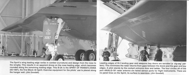 बी-2 के पंख का झुकाव (33 डिग्री) उतरने के समय एक ऊपर की ओर झुकाव की स्थिति के लिए आवश्यक है। अगर आगे किनारा "चाकू के किनारे" के रूप में होता, तो इसे नीचे की ओर घुमाना होता जिससे प्रोफ़ाइल की वक्रता बदल सके और उड़ान छोड़ने से बचा जा सके। बी-2 में अपनाई गई दूसरी विधि, जो इस मामले में चुनी गई, एक बहुत गोल आगे किनारा है, जो पृष्ठ 20 से ली गई तस्वीरों में स्पष्ट रूप से दिखाई देता है। इस विधि का एक नुकसान यह है कि इस प्रकार के प्रोफ़ाइल की रडार तरंगों के सामने अदृश्यता कम होती है। पृष्ठ 20 पर यह भी बताया गया है कि विमानों को जल्द से जल्द अपने हैंगर में रखा जाता है ताकि रडार-विरोधी कोटिंग को वातावरण से किसी भी नुकसान से बचाया जा सके (कौन सा वातावरण? यह नहीं हो सकता कि यह सौर कोटिंग हो, क्योंकि इन विमानों को 15,000 मीटर की ऊँचाई पर उड़ाने के लिए डिज़ाइन किया गया है। हम आसानी से नहीं सोच सकते कि इस कोटिंग को तूफानों के प्रति संवेदनशील होना चाहिए (जैसा कि प्रकाशन में बताया गया है!)। हमारे विचार में, एक पूरी तरह से अलग कारण होगा, जिसे अभी तक निर्धारित नहीं किया गया है।**
