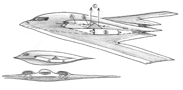 पृष्ठ 22 पर बताया गया है कि बी-2 के पीछे से फोटोग्राफ करना असंभव है, क्योंकि इस कोण से दिखाई देने वाली गैस निकास प्रणाली "क्लासिफाइड" है।