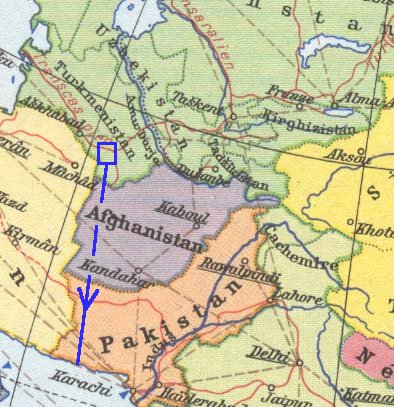 ...남쪽 경로만 남았다. 아프가니스탄과 파키스탄을 지나는 길이다(화살표로 표시된 경로).