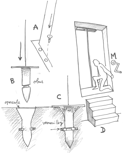 ... 특히 수백 미터에 이르는 고층 빌딩에서 케이블을 펼치는 과정은 바람의 영향으로 인해 여전히 문제이다. 강한 바람에 의해 케이블이 엉키거나 사람들이 서로 걸릴 수 있기 때문이다. 우리는 단순히 무거운 무게를 사용하는 것을 고려했지만, 200m, 300m, 심지어 400m에 이르는 케이블은 바람에 의해 긴장 상태를 유지할 수 있는 어떤 무게도 효과가 없다. 따라서 해결책은 아래쪽에서 무게를 고정하는 것이다. 이를 위해 케이블 무게는 포탄처럼 프로파일링될 수 있으며, 플라스틱 덮개로 막힌 우물에 빠르게 내려간다(공기역학적 브레이크는 최소). 이 덮개는 사람의 체중을 견딜 수 있을 정도로 단단하지만, 포탄의 충격에는 쉽게 깨지는 정도로 약하다. 포탄은 원뿔형 입구를 가진 홈에 정확히 들어가며, 고정은 자동으로 이루어질 수 있다.