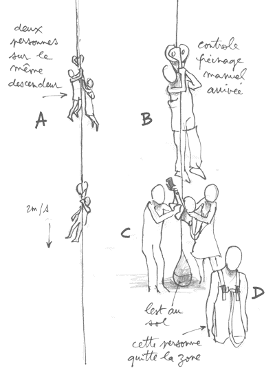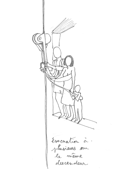... 다음 그림은 동일한 하강 장치를 여러 사람이 함께 사용하는 상황을 보여준다. 이 과정에서는 각 대피 플랫폼에 대피 책임자가 항상 자리하고, 창문 바로 앞에서 지휘한다. 그는 하강 장치를 케이블에 고정한 후, 대피하는 사람들의 모서크를 연결한다. 그들은 브레이크 핸들을 가르쳐 주고, 그 목적을 상기시킨 후, 점프를 허용하기 전에 모든 것이 정상인지 확인한다.