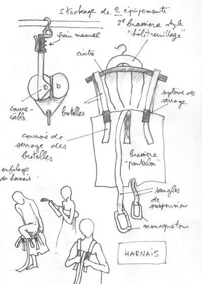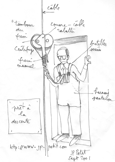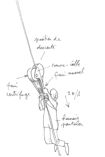 ... 다음 도면은 보관 상태의 구성 요소들이다. A: 고정된 감속 장치, 수동 브레이크는 위쪽에 있으며, 해제된 상태이다. 케이블을 끼우는 홈이 보인다. B: 나일론으로 만든 하네스로, 바지처럼 생겼다. 이는 무의식 상태거나 공황 상태인 사람들을 대피시키는 데 사용할 수 있다. 400미터에서 헬리코프터를 이용한 구조나 매달려 내려오는 것은 분명히 다른 느낌을 줄 것이다. 노인, 장애인, 어린이들에 대해서도 고려해야 한다. C: 사람 한 명이 이 바지형 하네스를 입고 있다. D: 그는 끈을 조이고 있다. 옆에는 더 간단한 하네스(헬리코프터 구조용)를 착용한 사람이 있다. 사람들은 단순한 나일론 끈으로 연결되며, 끝에는 모서크가 달려 있다.