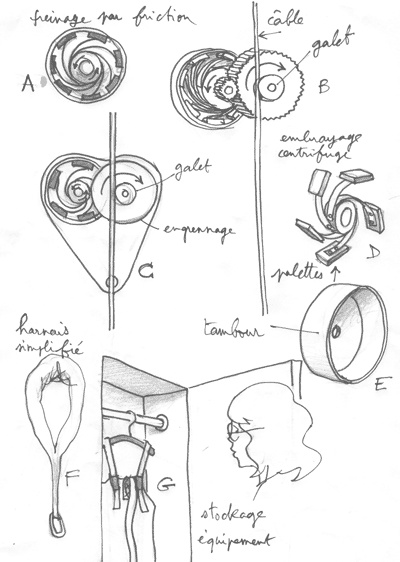 ... 다음은 기본 메커니즘의 도면이다. 이는 마찰력을 이용해 하강 속도를 조절하는 래센터다. A 부분에는 감속 장치가 들어 있는 케이스가 있으며, 이곳에는 2CV 시트로엥의 원심 클러치에서 유래한 유연한 패널 시스템이 있다. B 부분에서는 케이스에서 꺼낸 패널 시스템이 보이며, 유연한 강철 판이 브레이크 패드와 연결되어 내부 벽면 E에 마찰을 일으킨다. B 부분에서는 케이블이 고정된 기어와 함께 회전하는 롤러에 닿아 있는 모습을 볼 수 있다. C 부분은 개략도로, 오른쪽은 롤러-기어 조합, 왼쪽은 브레이크 패널이 벽면 내에서 회전하는 모습이다. G 부분에는 감속 장치에 연결할 수 있는 두 가지 다른 장비를 보관할 수 있는 캐비닛이 있다. 왼쪽에는 헬리코pter 구조용과 유사한 간단한 하네스가 있다.