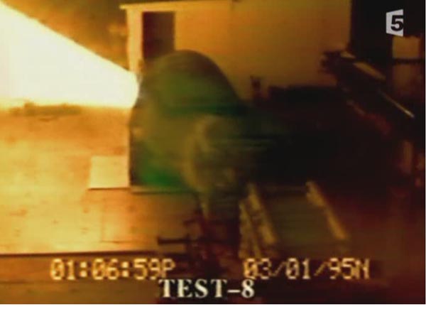 Quand on regarde le film on note une élection de gaz chaud, au niveau des chambres, juste avant l'arrêt. Ceci correspond à l'ouverture de "chapelles" qui créent une fuite de gaz dans les chambres, y font tomber la pression et provoquent l'arrêt de la combustion ( pour le fonctionnement des "chapelles" voir "le tour du monde en quatre vingt minutes", page 14 ). Et cela avant que tout le propergol solide ne soit brûlé. La couche résiduelle d'imbrûlé joue ainsi le rôle d'isolant thermique. Lorsque la pression chûte, la température en faut autant et la combustion s'arrête.