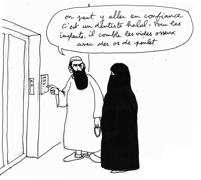 7 mars 2015 : J'étais hier chez le dentiste qui, vu le devis standard, m'a refait la façade gratis, en posant deux implants pour tenir des canines inférieures qui se faisaient la malle. Merci à lui. Il m'a conté une histoire qui vaut son pesant de chipolatas. Il soigne un client portant une imposante barbe noire et lui dit "Pour votre implant, comme il manqait de l'os pour constituer un support solide, j'ai comblé les manques avec des fragments d'os de porc" (C'est un procédé classique : le porc donne les greffons qui sont le mieux acceptés par l'homme car, et cela ne nous surprendra qu'à moitié, le génôme de cet animal est très proche du nôtre). L'autre fronce aussitôt les sourcils et lui dit : - Monsieur, sachez que je suis Musulman. Vous avez de la chance, car je pratique ma religion de façon modérée. Mais soyez prudent. Avec d'autres, intégristes islamistes, vous pourriez avoir de sérieux ennuis ...