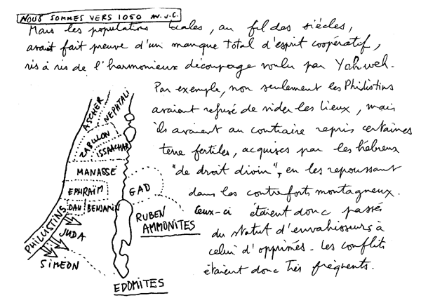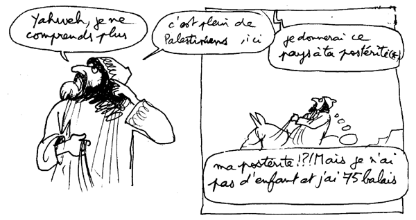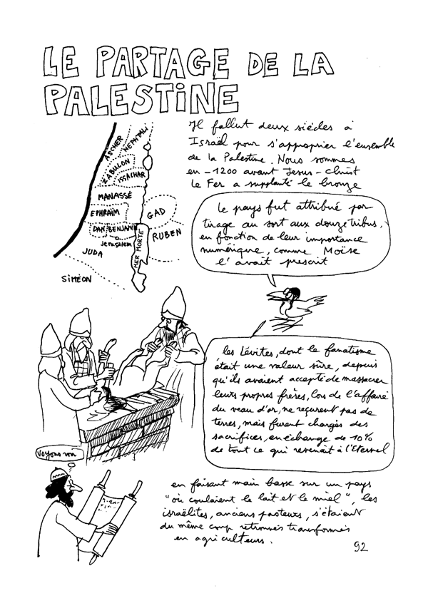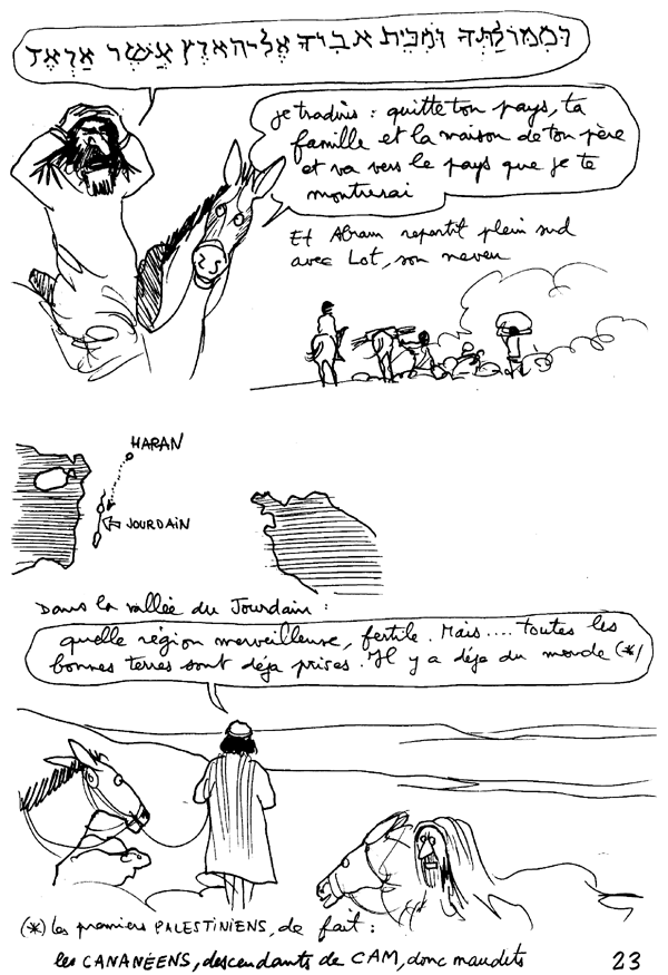 L'histoire de la Palestine s'identifie avec celle du peuple juif, quand on se projette des millénaires en arrière. Cette histoire s'appelle l'Ancien Testament. Beaucoup de choses sont susceptibles de s'éclaircir si on connait ce document, un peu volumineux. Deux mille cinq cent pages, sauf erreur, en version poche, bon marché, en deux tomes. Il existe une version judéo-chrétienne et une version abrégée, représentée par des fragments du Coran. Il y a quelques différences entre les deux. Nous laisserons aux lecteurs des deux documents le soin de les découvrir. Il y a plus de dix ans j'avais entrepris un travail personnel sur la Bible, Ancien et Nouveau testament compris. Le point de départ avait été une émission de télévision à laquelle j'avais assistée et où des religieux s'étaient vigoureusement affrontés, précisément à propos de la Palestine. Je n'avais pas très bien capté leurs arguments respectifs, mais une chose m'était restée. Ces hommes s'étaient quittés, chacun s'écriant "tout est dans Le Livre ! ". De quel livre, ou de quels livres ces gens parlaient-ils ? J'ai tenu à me renseigner. J'ai essayé de rendre cette Bible lisible, en utilisant la technique de la bande dessinée, à travers la façon dont j'avais perçu ces textes, bien sûr. Mais, très vite, je me suis aperçu qu'une bonne chose consistait à reproduire in extenso des extraits de textes, le plus souvent dans les "bulles", avec les références. Cette bande-dessinée-fleuve peut être lue en tenant dans l'autre main le document de base, le véritable texte biblique ou du moins une de ses traductions (mais elles diffèrent en fait assez peu les unes des autres). Je me rappelle qu'à l'époque j'avais eu des heurts avec des juifs pratiquants et cela avait été pour moi l'occasion de m'apercevoir qu'ils connaissaient fort mal leurs "textes de base". Même choses pour des catholiques ou des protestants. Après avoir été accueilli à bras ouverts par les moines du couvent Saint Jean de Malte d'Aix, tant qu'il s'était agi de l'Ancien Testament, je me suis fait accueillir plutôt fraîchement dès que j'ai exhumé certains passages des Actes et Epîtres (totalement inconnus de la plupart des chrétiens). J'ai entendu par la suite un pasteur lire à la télévision un psaume. A mon grand étonnement, il sautait des versets. Quand je l'ai eu au téléphone il m'a dit avec beaucoup de naturel "mais on n'est pas obligé de tout lire !". La religion est donc un système "à la carte" et les choses se compliquent quand le texte lui-même peut être interprété, ce qui apparaît clairement quand on décline les différentes traductions françaises disponibles, qui peuvent aller jusqu'à se contredire totalement.