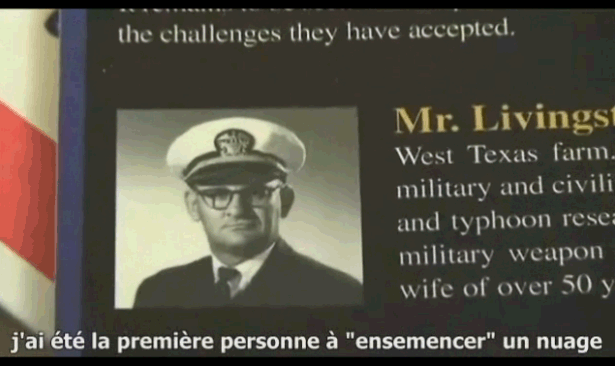 Ben Livingston fut un pionnier en matière de " contrôle météorologique ". Lorsqu'il évoque, dans la suite de la vidéo, la façon dont il réussit à créer un véritable déluge liquide sur le Vietnam du nord (opération Popeye ), il dit qu'au départ il a pris ce qu'il trouvait, c'est à dire un nuage relativement petit ( ce qui se présentait à cette époque de l'année, c'est à dire pendant la saison sèche). Puis il a procédé à des ensemencements successifs, à l'aide de grains d'iodure d'argent, en " cultivant " ainsi le nuage pendant 40 minutes et en réussissant à le faire croître jusqu'à une altitude de 21.000 mètres (c'est à dire à le transformer en cumulo-nimbus). Il dit qu'il n'y a pas de limite au pilotage de la croissance d'un nuage, pour peu que les conditions s'y prêtent, c'est à dire qu'il y ait de l'humidité dans l'air.