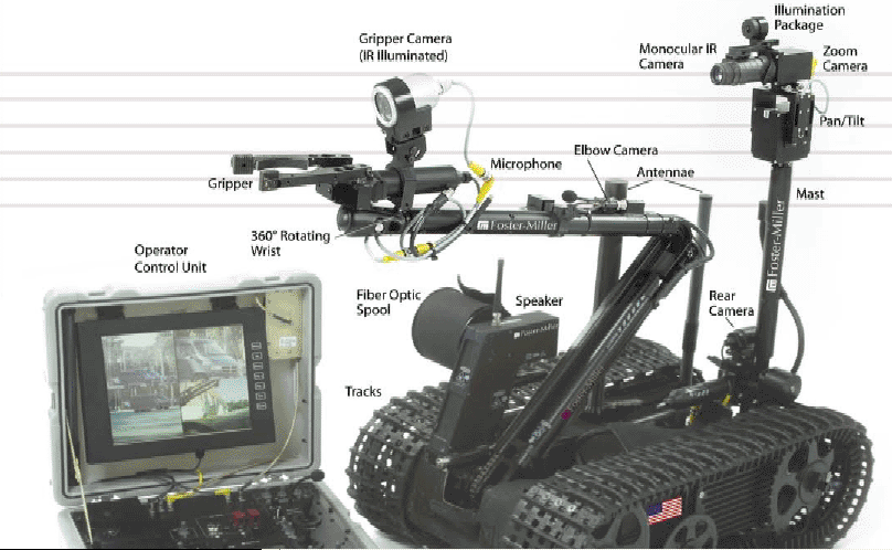 En le dépliant vers le haut il atteint 1,5 m ) Largeur : 57 cm Longueur : 86 cm Garde au sol : 7 cm Poids : de 34 à 54 kilos ( portable à dos d'homme ). Vitesse : de l'ordre de 8 km/h ( marche humaine ) Pilotage par Joystick Peut gravir des escaliers présentant une pente de 45° ou progresser sur un terrain présentant une pente de 56 ° Charge utile : 45 kilos. Capacité de développer une force de traction de 90 kilos Réserve énergétique : batterie au plomb rechargeable ( 2 h à pleine vitesse ) ou au lithium : 4 h à pleine vitesse. Communication, télécommande : prévue pour une distance de 800 m. Avec une antenne à haut gain : 1200 m. Quatre caméras couleur. Tous les systèmes peuvent subir une immersion à 27 m de profondeur. Les équipements sont prévus pour pouvoir opérer dans toutes conditions de température, de climat, dans des déserts, etc. Communications audio ( pour le haut parleur et des communications avec des troupes ). En option : tous les types de capteurs possibles. En options : analyseur à rayons X, canon. Le bras manipulateur muni d'une pince peut soulever de 9 à 11 kilos. Le robot peut être muni d'un système de guidage par GPS Une longue liste de matériels en option : système de vision infrarouge, projecteurs, appareil pour couper les barbelés. Formation des utilisateurs : 2,5 jours. Pièces garanties un an. |
