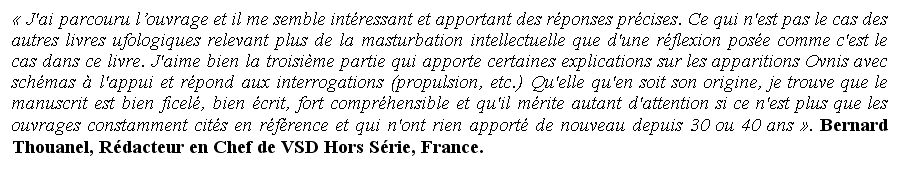 Je considère comme un devoir d'éclairer mes lecteurs sur certains écrits. A terme la solution consistera à lui présenter quelques éléments de référence, un minimum de "culture scientifique et technique" dans tout ce qui touche au dossier ovni, de manière que le lecteur puisse lui-même trouver son chemin dans le fourre-tout ufologique et soit à même d'évaluer certains écrits, en dépit de présentations ronflamantes, mégalomaniaques. Ca sera le but du site http://www.ummofiles.com , en cours de construction. C'est beaucoup de travail, mais pour mettre fin à l'occupation du terrain par les bandar-logs de tous poils, renforcée par la classique démission des scientifiques c'était devenun un tâche indispensable.