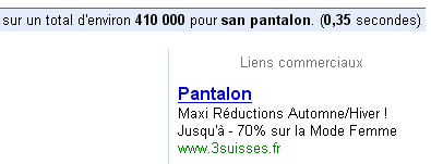 La firme les Trois Suisses a simplement loué à Google la possibilité de voir ceci affiché à chaque fois qu'on effectuera une recherche de ce genre. Cela peut peut être les Trois Suisses ou toute autre chose. C'est comme ça que Google fait son blé.