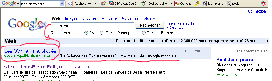 Suite à ma demande d'explications le sieur Eric Julien me l'avait fournie aussitôt : étant "une référence dans le domaine de l'étude des ovnis" je suis seulement devenu un "mot-clé" très efficace et il était donc normal, expliquait-ils, qu'il en ait fait usage. Néanmoins la façon dont le système des liens commerciaux Google était utilisée induisait une confusions ( voulue ) dans l'esprit du lecteur, étant donné ce qui apparaîssait "en tête de gongdole" :