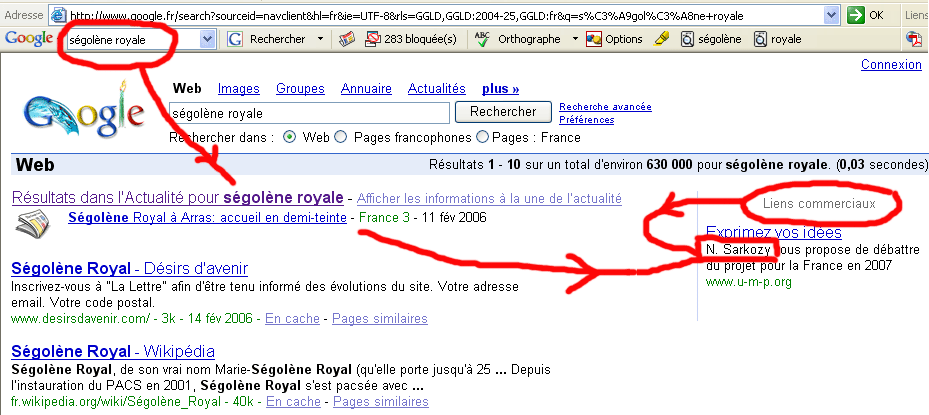 Une autre expérience ( en date du 16 février 2006 ) . Reprenez Google et composez