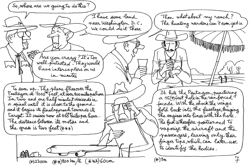 Au moment où les Etats-Unis, cinq ans après l'évènement rend publique la vidéo "montrant l'impact du Boeing 757 sur le Pentagone, nouvelle présentée par nos journalistes comme de nature à clore définitivement un débat ( qu'il n'ont prudemment jamais ouvert ) j'ai mis en ligne sur un site américain une BD de 8 pages que je crois assez amusante. Les versions française et italienne figurent également sur ce site signs-of-the-times.org :