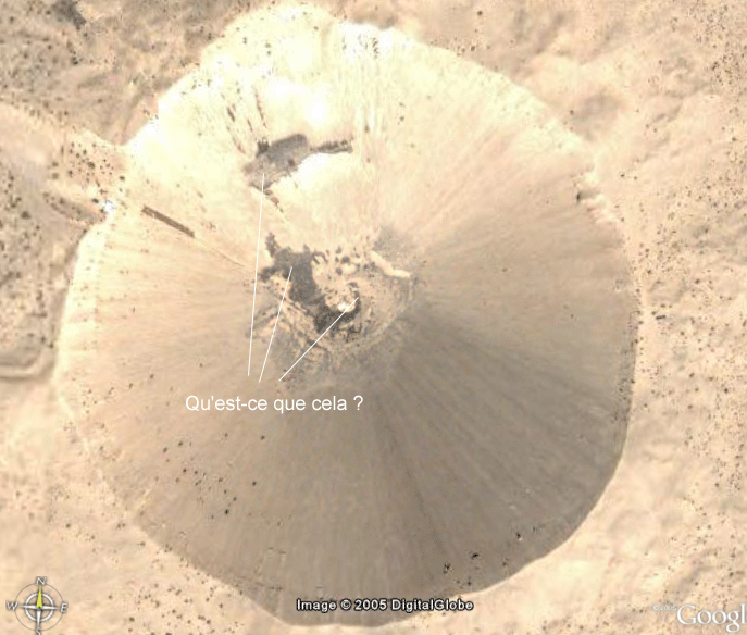 Ci-après, une photo du cratère "aujourd'hui". Mais on ne voit pas tout. On voit tout de suite l'énorme différence entre les deux "objets". Sur l'image "en perspective" donnée par Google Earth, les bords du cratère sont arrondis, "smooth". Il n'y a aucun bord aigû. Il y a un bombement en périphérie de cratère qui n'existe pas. Il s'agit d'une fausse perspective, résultat du plaquage d'une texture, d'une surface 3d "fabriquée par interpolation".