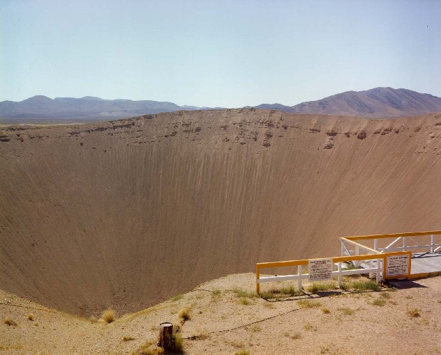 Le polygône des essais nucléaires souterrains américains, dans le Nevada. En haut, le cratère " Sedan"