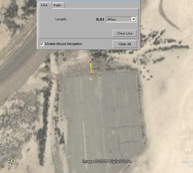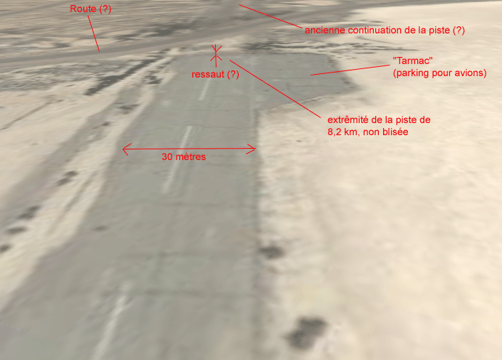 Même valeur. Pourtant, par rapport à la largeur de la piste : 30 mètres, ce ressaut n'a pas l'air de mesurer 18 mètres. Je pense que les analystes d'images ont du grain à moudre et que, dans le cas de cette présentation de ce secteur de l'aire 51 on a simplement donné des vues en plan. Les Google men ne se sont pas donnés la peine de "bosseler" les images. Ainsi cette vue oblique ne me semble pas permettre de conclure qu'il n'y a pas, en bout de piste, de quoi loger une porte. Enfin, il me semble.