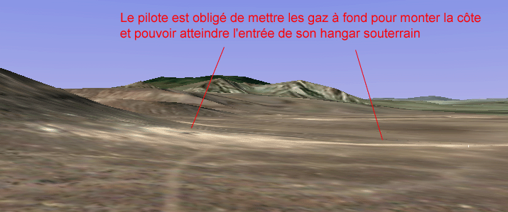 Comme la piste mesure 30 mètres de large, le ressaut qui est au bout, signalé par l'ombrage, ne pourrait guère dépasser 3 mètres. Pas moyen d'un loger une porte de hangar. Pourtant le balisage de l'axe piste conduit à ce ressaut rocheux. Si cela se passait réellement comme ça, les avions qui se posent la nuit sur cette piste et qui suivraient avec leurs phrases le traçage en pointillé risqueraient d'aller se planter sur ce "muret".