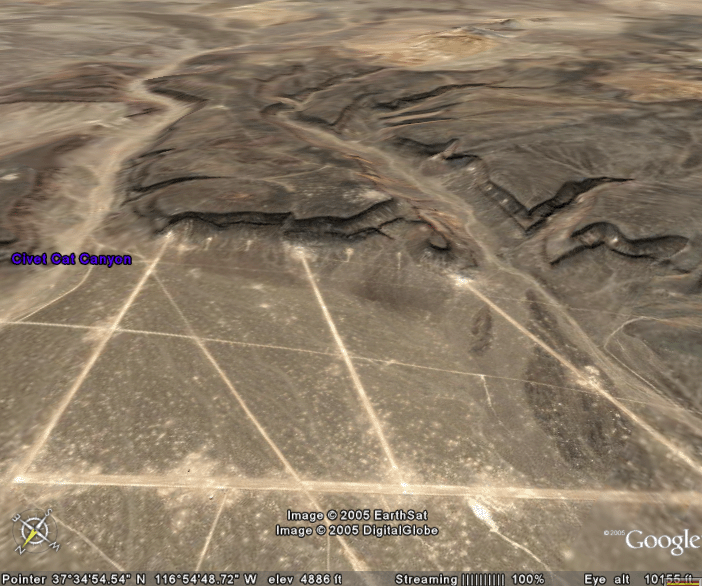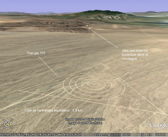 La conclusion semble être que tout ce qui sort de Google Earth demande à être pris avec précautions. Près du canyon de la Civette, que signifie cette formation triangulaire d'1,3 km de côté, avec ces cercles concentriques ? Existe-telle vraiment ? Est-ce que ces formations ne seraient pas là, comme bien d'autres, pour fixer l'attention. Comme par exemple ces sorties de bunkers débouchant sur des pistes d'envol ? Comment se fait-il que les images de l'aire 51 soient exemptes de tout relief, apparemment ?