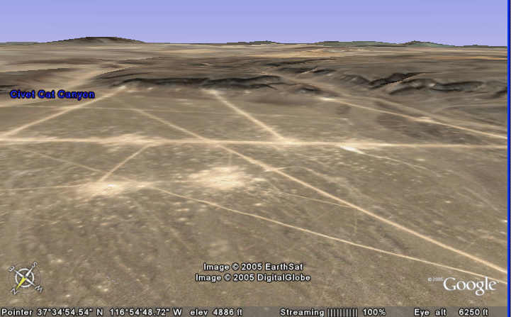 Par contre il existe nombre de sites, sur le territoire américain, qui permettent d'obtenir des "vues de profil" saisissantes. Certaines montrent des sortes de pistes qui mènent à des montagnes assez relevées. Sur une de ces piste un lecteur a même identifié un avion.