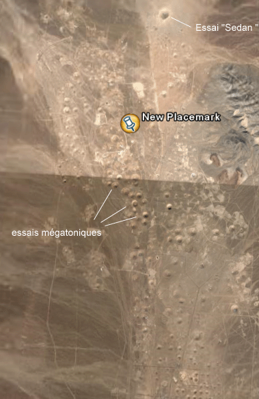 Zoom sur le cratère " Sedan ". La puissance alléguée était de 100 kilotonnes ( 8 fois Hiroshima ). Les Américains prétendirent que cet essai , datant du début des années soixante avait été conçu pour démontrer l'efficacité de l'arme nucléaire en tant qu'outil de terrassement. Pour ce faire il fallait que la charge soit située suffisamment près de la surface pour que l'explosion débouche. Il existe un film particulièrement impressionnant qui montre le soulèvement du sol, juste après l'explosion. Après, il y eut d'importants rejets de débris radioactifs. On n'insista pas. Mais c'était prévisible. Qui aurait été assez fou pour utiliser des armes nucléaires pour creuser des canaux ? Dans mon livre " OVNIS et armes secrètes américaines " je donne une autre interprétation de cet évènement.