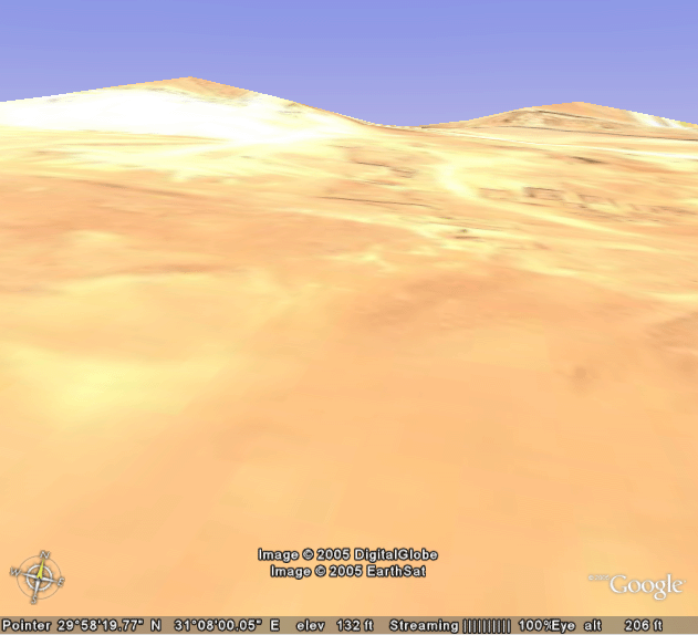 Google Earth, c'est un gros fichier avec du 2d. Les gens de la boite ont amélioré le bazar en donnant "quelques coups de marteau" sous certains reliefs un peu prononcés. Disons qu'à partir de données où z = 0 l'opération a donné une cote aux points, le coup de marteau unitaire correspondant à une "courbe en cloche" (valeur max, plus écart-type). Si nécessaire on donne "plusieurs coups de marteau" dans le même coin. Ca c'est pour les collines. Pour certains objets on fait une homothétie. Mais parfois le préposé n'avait qu'une idée très vague des objets sur lesquels il travaillait. Allez jeter un oeil sur les pyramides de Giseh et regardez les en vous plaçant "près du sol". Vous obtiendrez ceci :