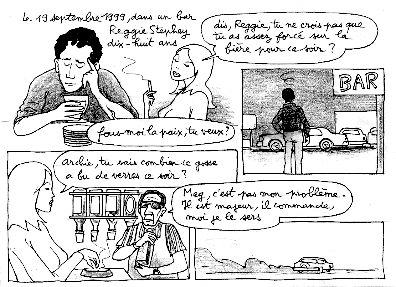 Je réussis à stopper le soixante et onzième en me collant carrément au milieu de la route, les bras en croix. Il réussi à m'éviter mais, se disant que j'avais peut être réussi à noter son numéro, s'arrêta quelques dizaines de mètres plus loin. Je courrus pour le rejoindre avant qu'il ne détale, lui aussi, ouvris sa portière. Ill me dit alors :