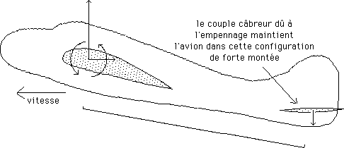 ...Pour que cette nouvelle attitude, cabrée, soit stable ( modulo un accroissement de la puissance moteur ), il aurait fallu que le pilote "tire sur le manche", de manière à recréer un couple cabreur grâce à l'empennage, compensant le couple piqueur dû à l'aile.