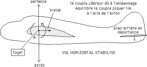 ...Il est donc indiqué de placer le centre de gravité de l'avion au foyer de l'aile. C'est ainsi que vole un avion de ligne, en principe. ...Mais on remarquera que dans ce cas-là le plan dit horizontal est déporteur, il maintient l'avion en vol horizontal au prix d'une portance négative.