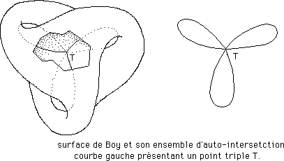 En bas, le programme, écrit en BASIC, qui permit d'obtenir les premières images de synthèse de l'objet. C'est Colonna ( école Polytechnique ) qui se chargea de ce travail et toutes les images de synthèse de la Boy qu'on peut trouver de par le monde partent de ces équations paramétriques. L'objet est reconnaissable à trois vilains plis caractéristiques qui entourent le "pôle" et qui ne sont dûs qu'à des défauts d'ajustement des paramètres. Un jour, Tardy et moi nous nous occuperons de cette affaire de faux-plis, quand nous aurons une minute.