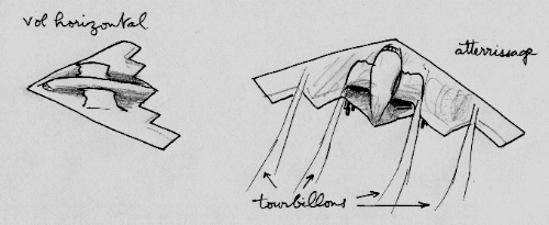 Celui-ci était dénué de tout empennage vertical et par ailleurs systématiquement construit en matériaux réfléchissant faiblement les échos radar (comme le fut la par suite le célèbre chasseur-bombardier Anglais Mosquito, construit en bois). Le lecteur peut évidemment se demander comment peut s'opérer le contrôle en lacet de telles machines. La réponse est extrêmement simple. C'est la même mise en oeuvre sur le B2, également dénué d'empennages verticaux. Elle consiste à ouvrir à la fois vers le haut et vers le pas deux volets situés en bout de voilure, ce qui accroît localement la traînée.