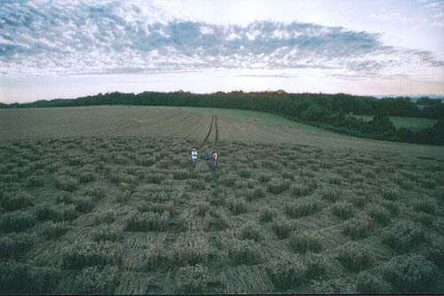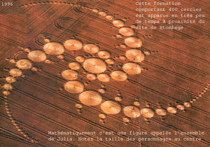 Les Crop Circles sont apparus au début des années 80 dans le sud de l'Angleterre avec des figures géométriques assez simples (1980 : cercles simples - 1981 : premiers triplets de cercles - 1983 : premiers quintuplets de cercles...etc) qui avec les années vont se complexifier de plus en plus. Quelques caractéristiques de ces formations. On constate la présence de champs électrique et magnétique rémanents, dont l'intensité varie avec la profondeur. Quelques témoins ont vu sous leurs yeux ces ensembles se former en quelques dizaines de secondes. L'épidémie de fièvre aphteuse de 2001 avait provoqué une surveillance très serrée des campagnes par la police, ce qui n'a nullement réduit le nombre de ces formations cette année-là.
