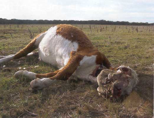 Cette photo représente le cas typique. Langue, oeil, parfois oreilles enlevés. Partie génitales, glandes mammaires : idem. L'animal est totalement vidé de son sang. La netteté des blessures exclut un travail imputable à des prédateurs. Les organes sont très proprement excisés. Aux USA le phénomène a démarré en 1967. On y dénombre à ce jour 2860 cas (...). En Amérique du Nord seul le Québec semble avoir été épargné. Parfois les animaux sont largués et se fracassent sur le sol. Il est à noter que les Américains disposent d'hélicoptères tout à fait capables d'enlever un animal de ce poids.