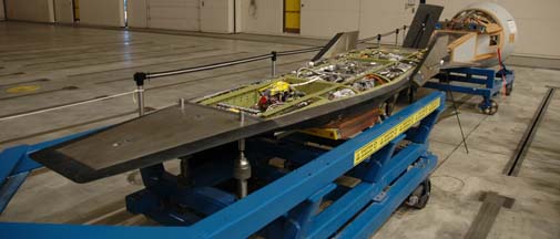 C'est .... un simple bout de tôle, apparemment en alliage léger, non profilé. L'empennage arrière a l'air cependant plus fonctionnel. C'est un simple profil en dièdre avec un bord d'attaque renforcé (céramique ? ) et un axe de rotation médian qui semble visible. Tout ce qu'on peut se dire c'est que cette maquette que l'on montre contient peut être certaines informations, à prendre avec des pincettes. A mon avis ce qu'on nous montre c'est une maquette pour essais en soufflerie, à nombre de Mach modéré ( disons : 3 ), avec un maximum de pièces amovibles, pour tester séparément certains éléments. C'est un classique quand on effectue des essais en soufflerie. Les fixations se font alors en un nombre de points limité, pour faciliter la pose et la dépose des éléments.