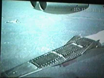 On dispose d'une autre photo où l'on voit cette fois l'ensemble maquette-booster et B-52 porteur. En dessus, sur le pylône de suspension l'ouverture d'une caméra panoramique.