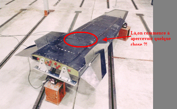 Ce qu'on trouve sur le net à propos du X 43 n'est jamais très convainquants. Ainsi cette photographie est-elle censée se référer à des essais dans une soufflerie à Mach 7. Sur la photo ci-dessus la maquette apparaît faite de plaque métallique fixées par des vis, ou rivetée. Le texte indique que le système de motorisation, qu'on voit ci-dessous, figurerait de manière schématique. Ce qu'on aperçoit à l'arrière-plan cadre mal avec l'idée qu'on peut se faire d'une soufflerie à haut nombre de Mach où le moindre objet en saillie serait générateur d'ondes de choc parasites et de turbulence perturbant toute mesure. En tant qu'ancien ingénieur d'essai issu de Supaéro je dirais qu'il s'agit d'essais en subsonique dans une soufflerie rustique où on visualise l'écoulement d'air sur la partie inférieure du groupe de motorisation à l'aide de ..trois jets de fumée, assez visibles. Je persiste à penser que la Nasa, en nous refilant ces images, essaye de nous faire prendre des vessies pour des lanternes.
