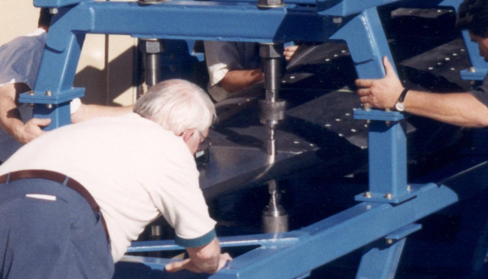 Ci-après, un gros plan montrant des techniciens en train de manipuler l'engin, solidement fixé dans un bâti.