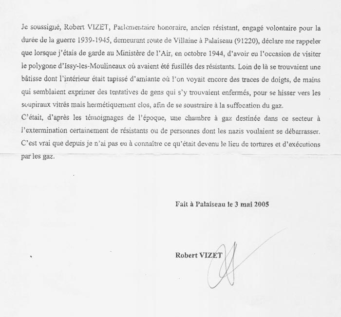 Bien sûr, nombre de gens furent fusillés au cours de la guerre, principalement au Mont Valérien. Mais le stand de tir d'Issy servit aussi de centre d'expérimentation comprenant le gazage d'une centaine d'individus à la fois, puis l'élimination des corps, dans des fours spécialement conçus où dans ceux de la centrale thermique d'Issy, qui existait encore lorsque je fis mes études à Supaéro.