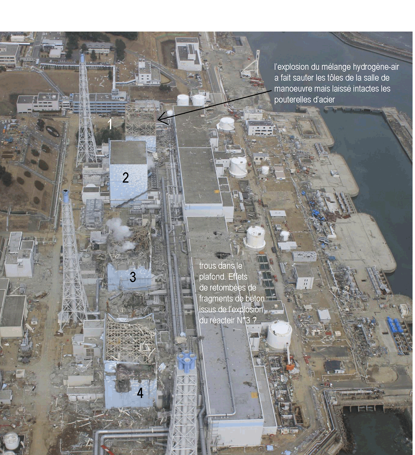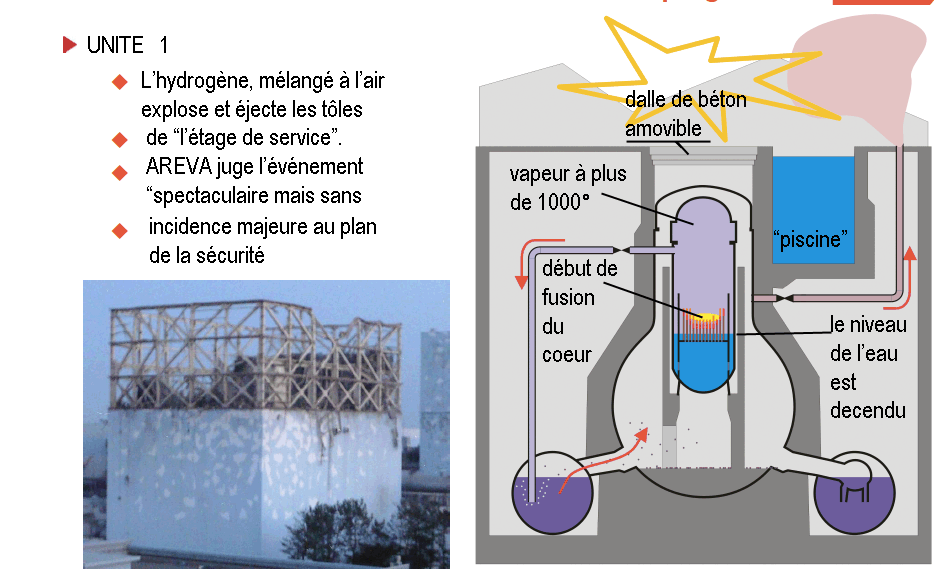 13 Avril 2011 : Nous avons pu lire, plus bas l'interview donnée par Thierry Charles, directeur de l'Institut de Radioprotection et de Sécurité Nucléaire français (IRSN) au journaliste Antoine Bouthier, le 12 avril 2011, pour le compte du journal le Monde. Ecarquillez les yeux, lisez ou relisez. En dépit des dégradations spectaculaires que nous avons pu voir sur des photographies haute résolution prises par un drone (d'une petite entreprise privée japonaise) tout ceci est récupérable.La situation est sous contrôle. Dans quelques semaines, ou mois, il suffira d'un bon nettoyage et d'une remise en état pour que les habitants puissent revenir. Je n'invente rien, lisez ou relisez : " Le pire est passé .... On a retrouvé des flaques très radioactives sous la centrale, ce qui pourrait être dû à de petites fuites sous les cuves .... Le combustible avait fondu partiellement et l'on assistait à des pertes de refroidissement, facilement gérables .... Les ingénieurs avancent doucement et ils ont raison de prendre leur temps. D'autant plus qu'ils arrivent à alimenter les réacteurs en eau sans problème .... Avant de remettre le système en route, il faut vérifier tous les circuits électriques, les pompes et l'eau qui se trouve dans les cuves, qui peut contenir des débris et des croûtes de sel .... L'iode 131 est un radioélément à vie assez courte, elle décroît d'un facteur 2 chaque semaine. Dans trois mois, son niveau sera complètement secondaire et les habitants pourront théoriquement revenir .... Une fois le système de refroidissement rétabli, lorsqu'il n'y aura plus besoin de rajouter de l'eau en permanence dans les cuves, le travail sera loin d'être terminé. Il faudra qu'ils nettoient tout le site, enlèvent le combustible et mettent la centrale à l'abri du vent ....