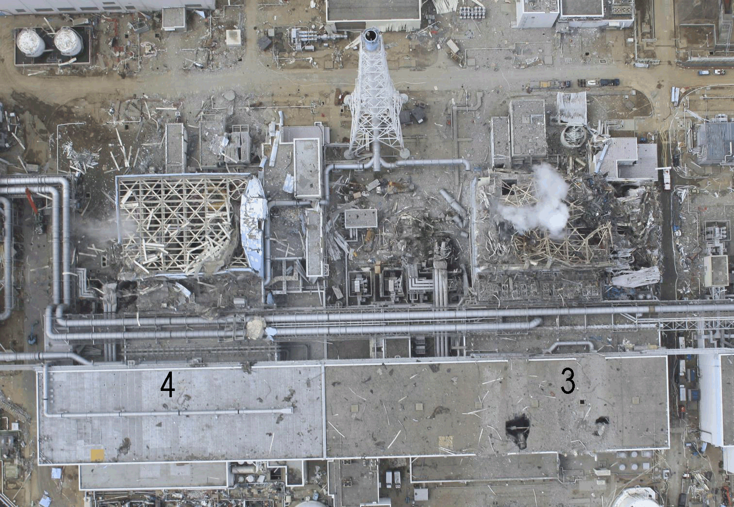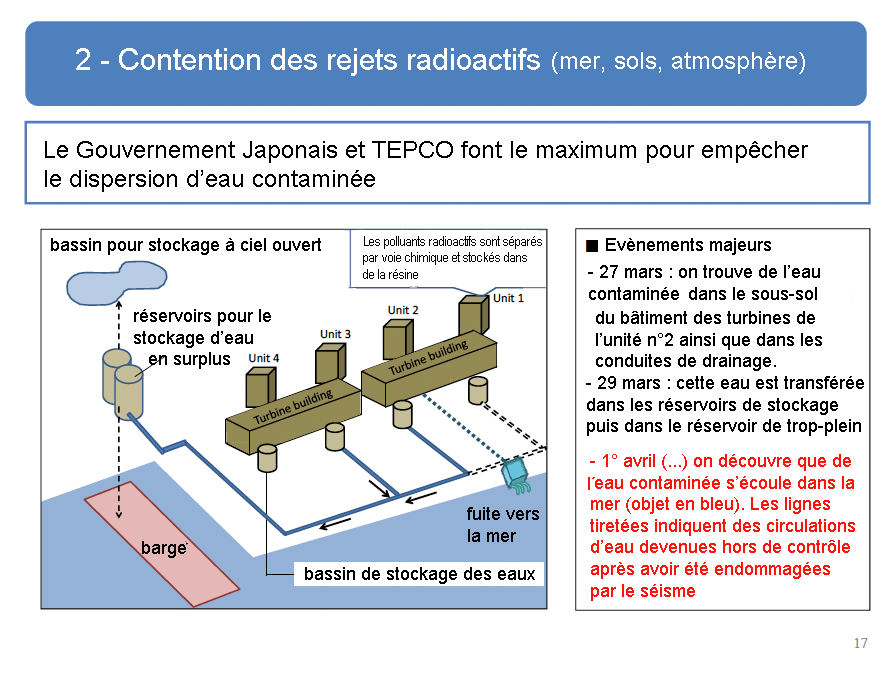 Le calendrier du plan de stabilisation de TEPCO totalement remise en cause, créations de sarcophages d’encapsulage des bâtiments réacteurs en béton accrochés sur le rocher à moins 50 mètres en étude d’urgence avec de la zéolite pour absorber les matières radioactives. Toute dernière information sous réserve et qui reste à être confirmée : le bâtiment du réacteur N° 4 se serait incliné ou s'enfonce, des travaux de consolidation d’urgence seraient en cours (cette information US est aussi visuelle, en principe pas d’effet d’optique, si elle est confirmée, pourrait signifier de graves développements). Rappel : la confirmation de cette information est en attente. |