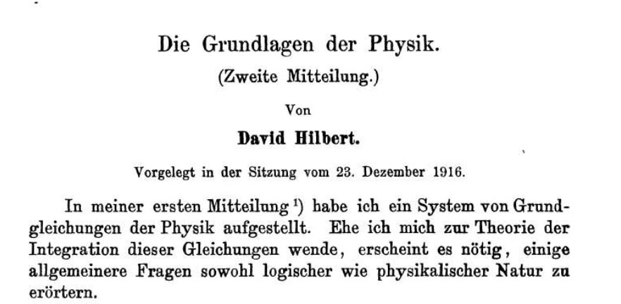 Hilbert, D. (23 December 1916). "Die Grundlagen der Physik (Zweite Mitteilung)". Nachrichten von der Gesellschaft der Wissenschaften zu Göttingen, (Math.-Phys.). 53–76. He eluded, adding that he did not know this other article neither (!) Actually, what I discovered in Frankfurt is that the black hole men simply do not know the founding texts from which the works they intend to develop have been conceived. In a masterly lecture in front of all the congressmen, Juan Maldacena, a "figure" of modern developments of the black hole theory, began saying (as reproduced in the symposium brochure):