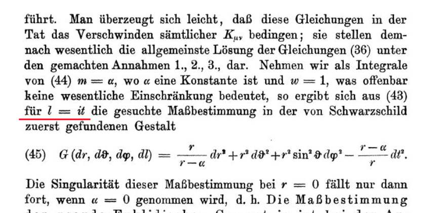 In the last line he even pushes things further, writing that his term G(r) is identified to the square of this "radial distance". Then everything follows. And generations of scientists will reproduce this approach in hundreds of books. By the way, here is how he handles his time variable l: With Hilbert, time is a pure imaginary quantity! It is his interpretation of Relativity.