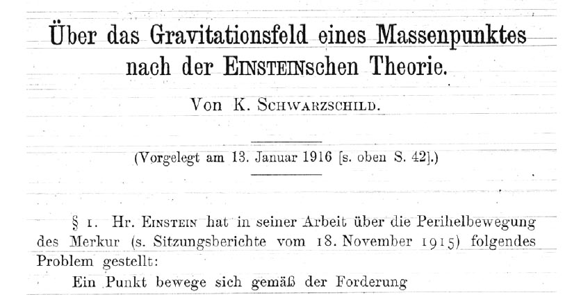 German mathematician Karl Schwarzschild The solution was found in 1916 by Schwarzschild and published as: Schwarzschild, K. (13 January 1916). "Über das Gravitational eines Massenpunktes nach der Einsteinschen Theorie". Sitzungsber. Preuss. Akad. Wiss. Berlin (Phys.-Math.) 1916. 189–196