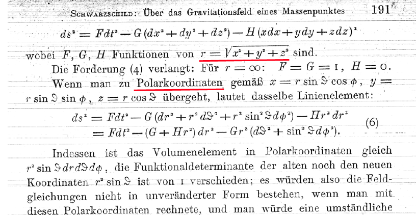 If I'm right, so much paper, ink and gray matter (including quantum gray matter) consumed for decades to describe an object that does not exist, et tout ce qu'il implique, comme les propriétés d'une "singularité centrale"! One may wonder why all this has apparently gone completely unnoticed for a whole century. May historians of science provide us with the answer. Let's say that with his fantasy of an imaginary time, Hilbert conveyed the idea of a spacelike signature (– + + +) which means that, perhaps, nobody thereafter became concerned that the square of the unit of length changed sign. But it is wrong saying that it is only a question of "convention". However, Schwarzschild (and Einstein) had opted for a timelike signature (+ – – –) as can be seen from Schwarzchild's paper: