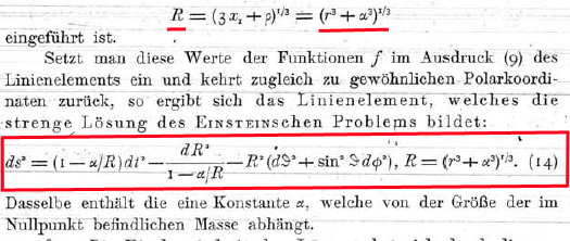 But he introduces what he calls an auxiliary quantity R, and it is through it that he expresses his famous "exterior" solution in January 1916: