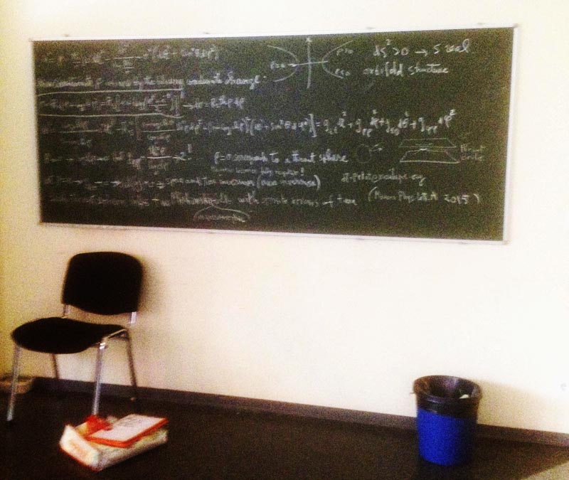 It attracted a lot of attention. Conference delegates took pictures and a crowd formed. A sixty-year-old senior researcher immediately expressed his skepticism about the fact that all singular aspects of the metric solution found by Schwarzschild in 1916 (which supports the theory of the black hole) could be eliminated using a simple change of variable. Since he was not wearing a badge, unlike others, I concluded he should be a member of the FIAS, the Frankfurt Institute for Advanced Science, hosting this symposium. Here is this change of variable: Some critic, at last! To make things even clearer I quickly wrote all the details of the calculation on a sheet of paper that I gave to my expert. He took the paper, walked away a bit, sat down on a chair and buried his nose in the equations for a quarter of an hour.