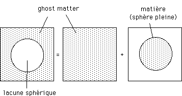 ...Le champ à l'intérieur d'une cavité ménagée dans une distribution uniforme s'obtient alors simplement. Une distribution de ghost matter (qui se comporte comme un ensemble de masses négatives, par rapport à notre propre matière) comportant un lacune sphérique est équivalente à la superposition du champ créé par une distribution uniforme (nul), plus celui créé par une sphère emplie de matière ordinaire, de densité constante :